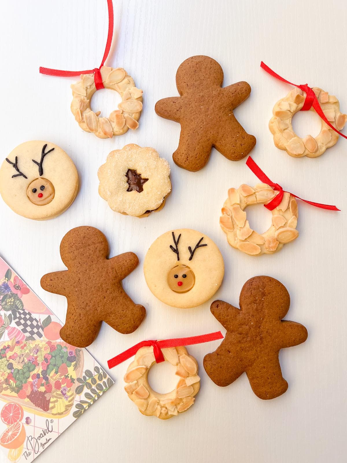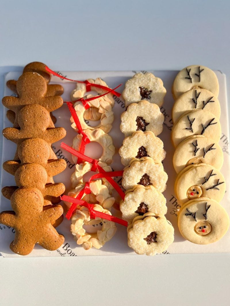 Handcrafted with care, and served on a reusable wooden 32x26cm board, this festive collection includes 24 cookies (6 of each, 720g total):